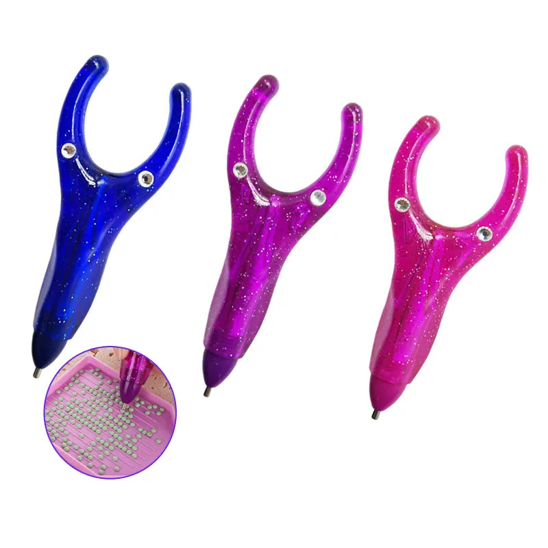 Speciaal gevormde Diamond Painting Pen waarbij de wijsvinger door de opening gelegd wordt. Door deze houding is druk op de vinger bij het vasthouden niet nodig. Geschikt voor Diamond Painters die last hebben van klachten aan de vingers.